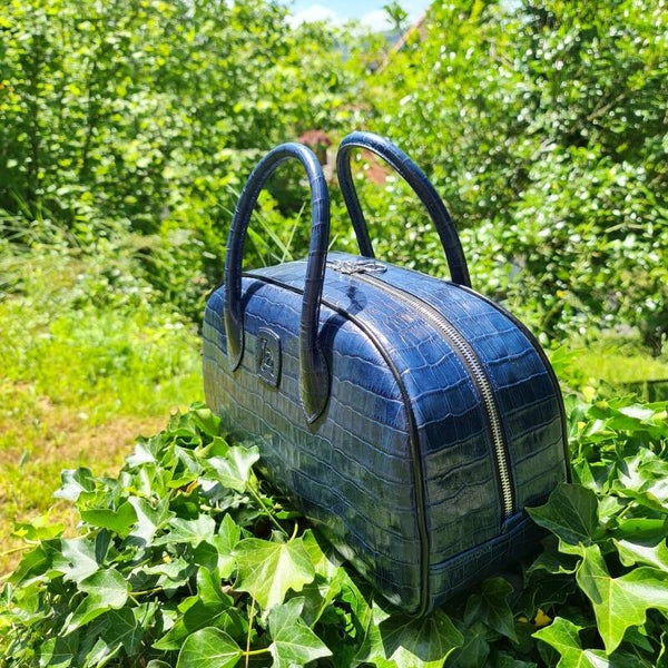 Handtasche mit Handvernähten Henkeln, aus geprägtem Rindsleder und mit Wildleder Innenfutter